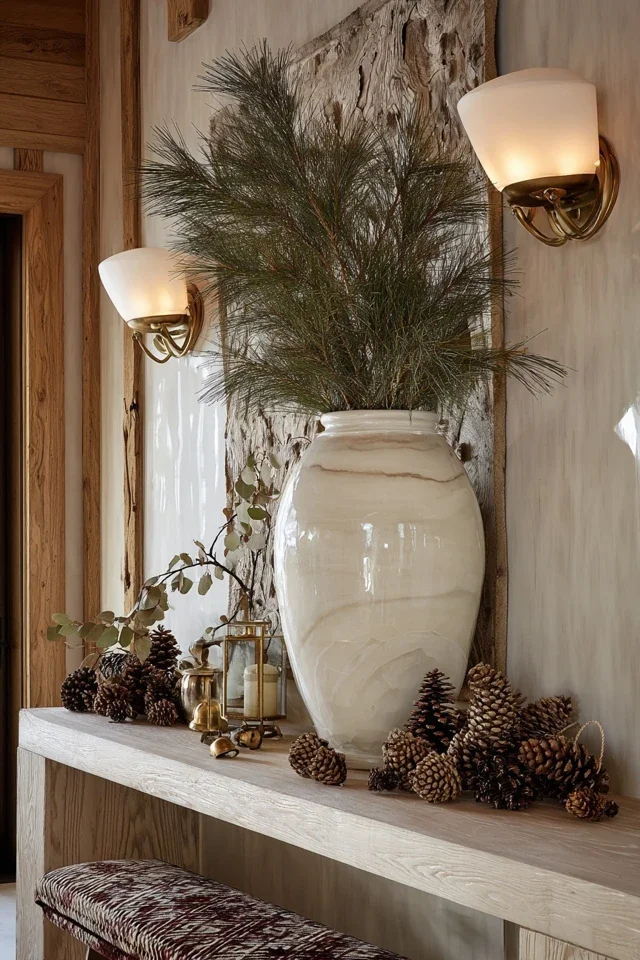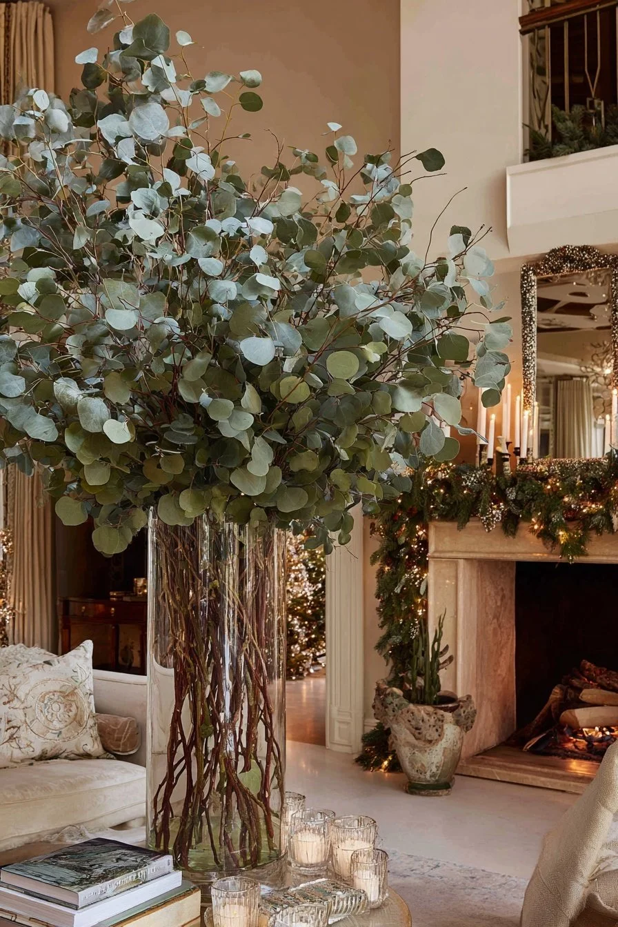 Nothing sets a neutral holiday scene like abundant evergreen foliage. Use high-quality faux greens for the look of winter botanicals with zero maintenance. Start with a base of mixed eucalyptus and pine for a classic, elegant touch.