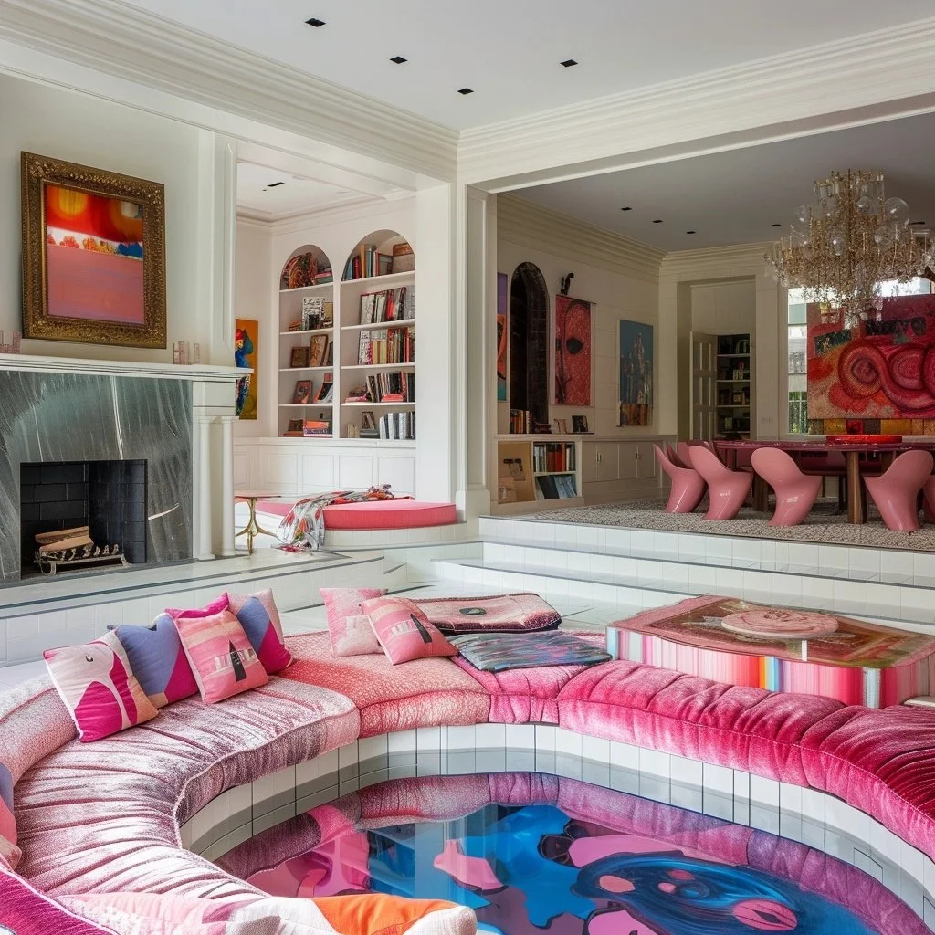 Description: This vibrant, sunken living room has captured hearts with its eclectic mix of bold colors, playful patterns, and eye-catching artwork. It’s a perfect example of how AI-driven prompts can push the boundaries of creativity, resulting in a space that’s both unique and inviting.